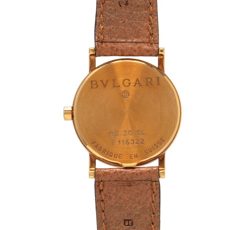 Stamps: Case back: BVLGARI BB 30 GL F 116322 FABRIQUE EN SUISSE. Clasp: BVLGARI 750. Case: 750 (Swiss hallmark). Inner case back: 18K 750 631 (Swiss hallmark).