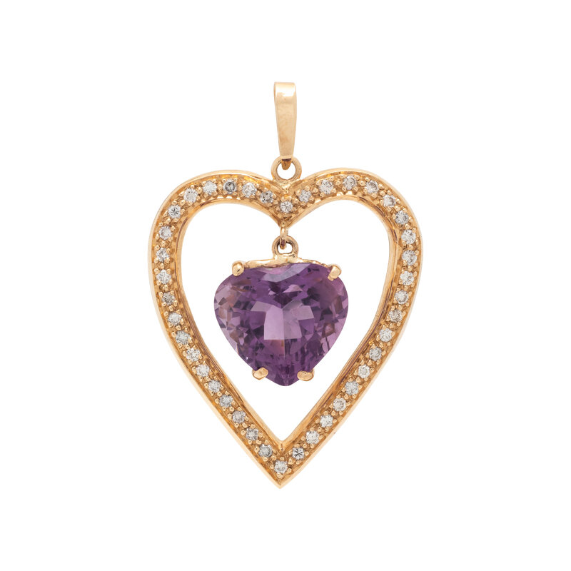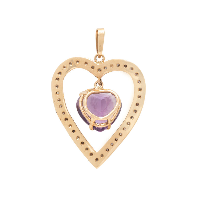 Heart shaped amethyst measuring approximately 14.10 x 15.40 x 10.15 mm, and round diamonds weighing approximately 0.60 carat total. Yellow gold. 1 3/4 x 1 1/4 inches.