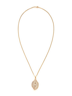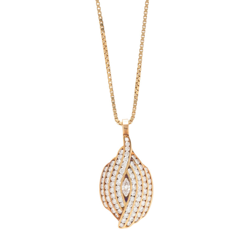 Marquise and round diamonds weighing approximately 2.60 carats total. Yellow gold. Chain: 18 inches long. Pendant: 1 1/2 inches long.