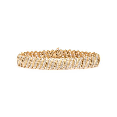Baguette cut diamonds weighing approximately 5.00 - 5.50 carats total. 14 karat yellow gold. 6 7/8 inches long.