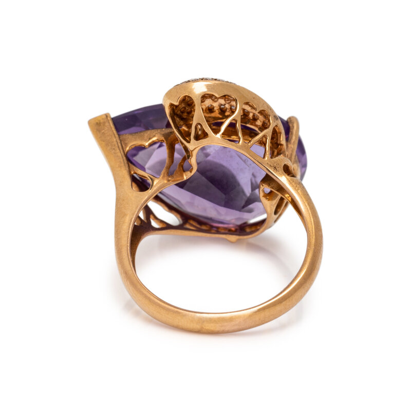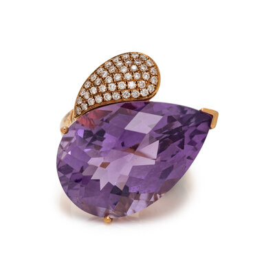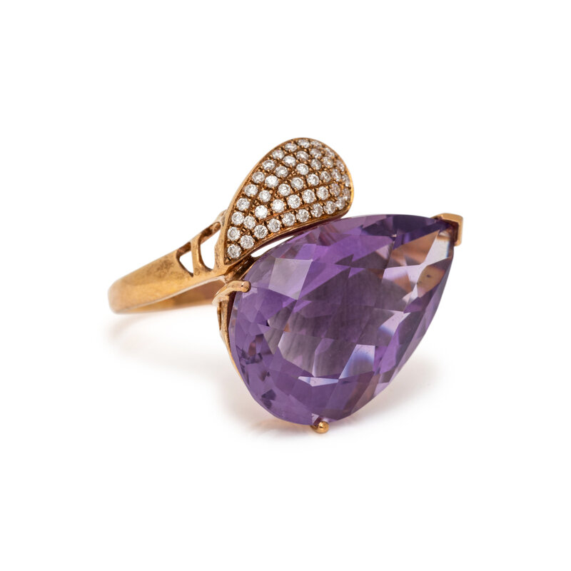 Pear shaped amethyst measuring approximately 23.85 x 15.75 x 11.75 mm and round diamonds. 18 karat yellow gold. Ring size 8 1/4.