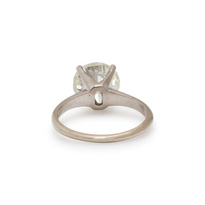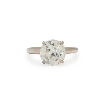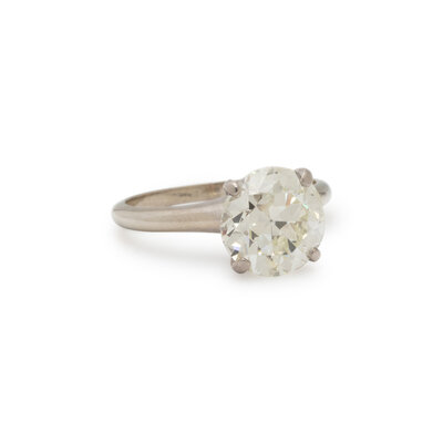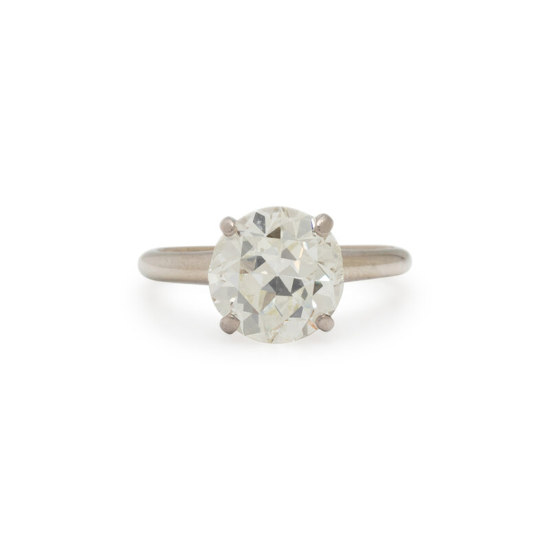 Transitional cut diamond weighing approximately 2.70 carats by formula. 14 karat white gold. Ring size 5 3/4.