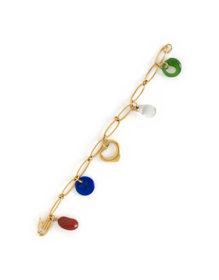 Five charms including a red jasper Bean, jade Eternal Circle, rock crystal Teardrop, lapis round pendant, and yellow gold Open Heart, on a fancy link chain. 18 karat yellow gold. 6 1/4 inches long.