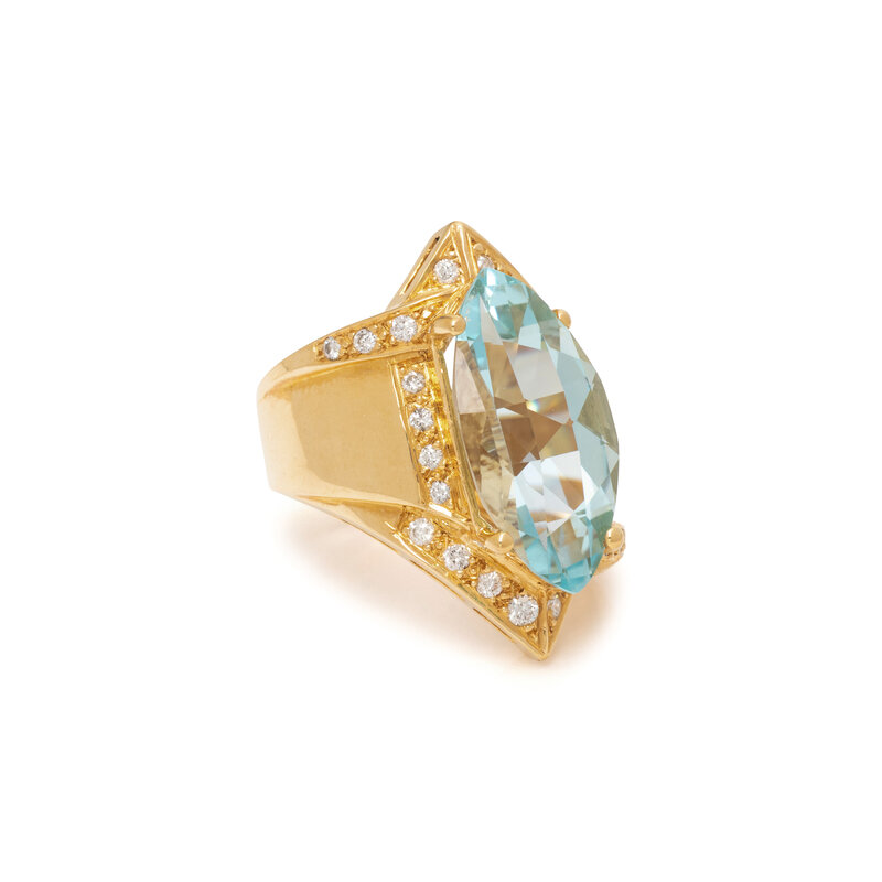 Marquise checkerboard faceted aquamarine measuring approximately 22.00 x 11.00 x 8.00 mm, and round diamonds. 18 karat yellow gold. Ring size 6.
