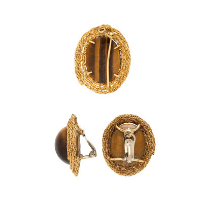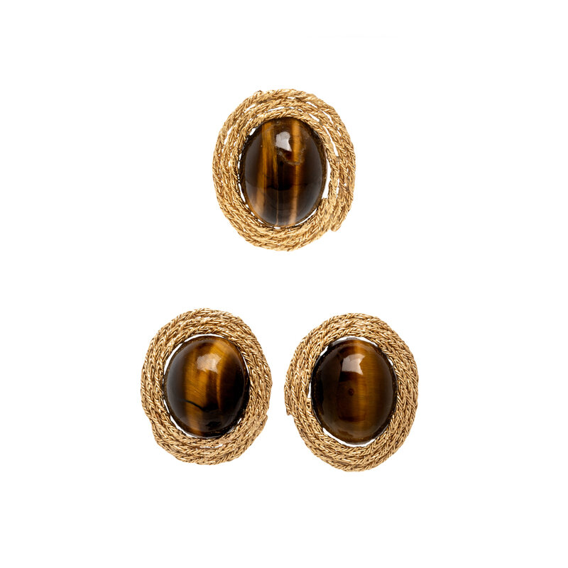 Oval cabochon tiger's eye measuring approximately 20.00 x 16.00 x 12.50 and 23.00 x 16.00 x 11.50 mm. Yellow gold. Earrings: 1 1/8 inches long. Brooch: 1 1/4 x 1 inch.