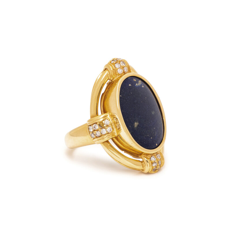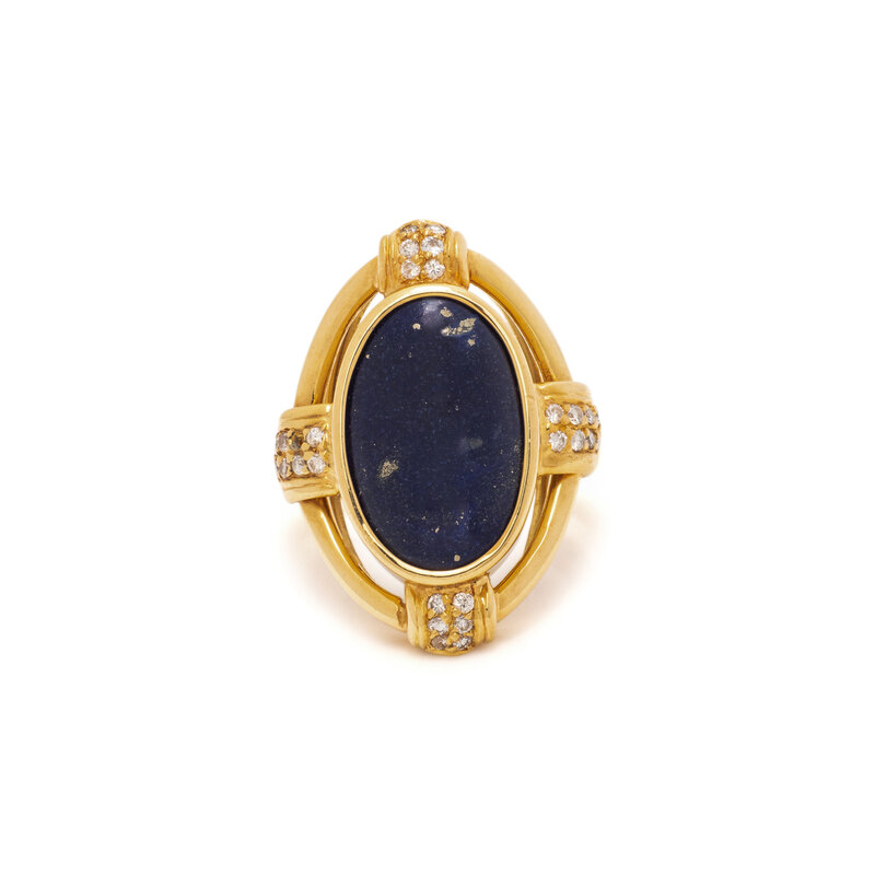 Oval cabochon lapis lazuli measuring approximately 17.00 x 11.00 mm, and round diamonds. 18 karat yellow gold. Ring size 7 1/2.