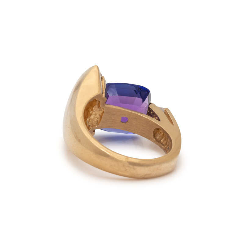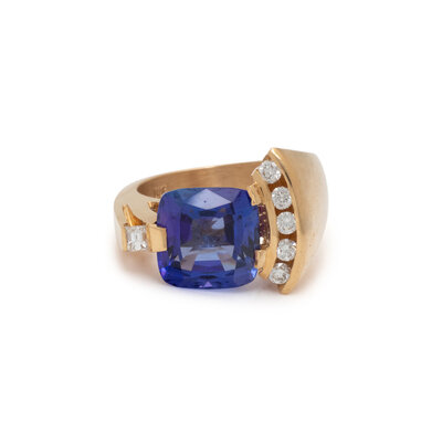 Cushion cut tanzanite weighing approximately 4.70 carats by formula, and round and square diamond accents. 14 karat yellow gold. Ring size 7.