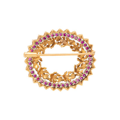 Round rubies. 18 karat yellow and white gold. 1 1/2 x 1 1/4 inches.