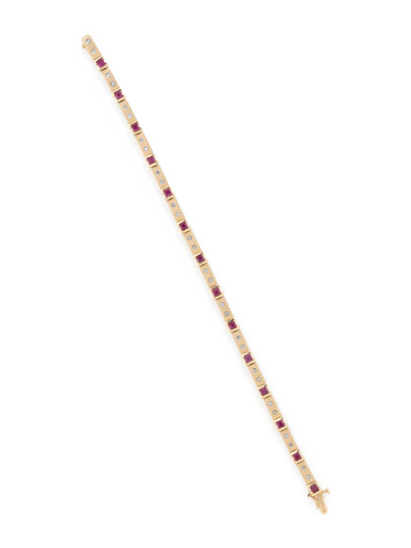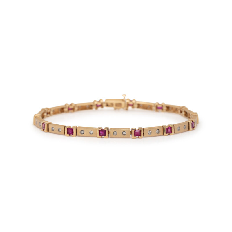 Square synthetic rubies and round diamonds. 14 karat yellow gold. 7 inches long.