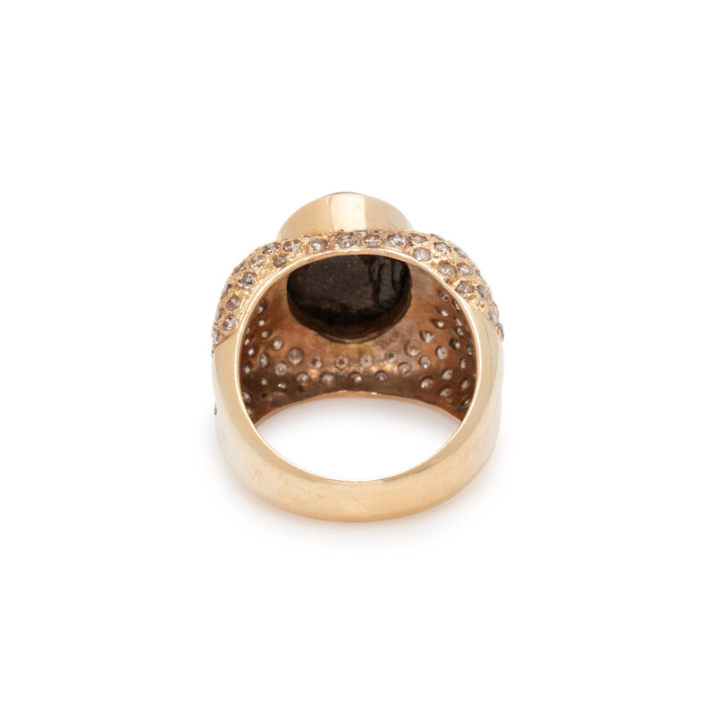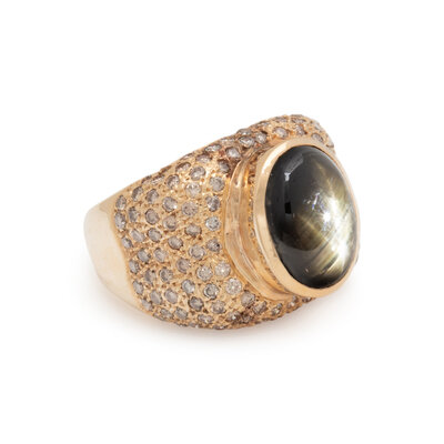 BLACK STAR SAPPHIRE, DIAMOND, AND YELLOW GOLD RING