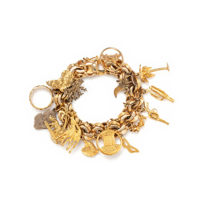 Seventeen charms total. 14 karat yellow gold with yellow gold, gold-plated, sterling silver, and agate charms. 7 3/4 inches long.