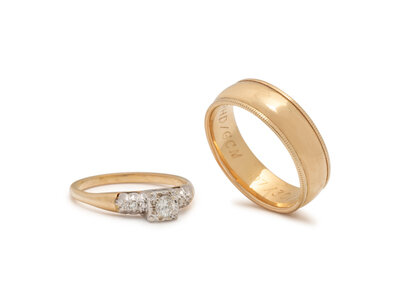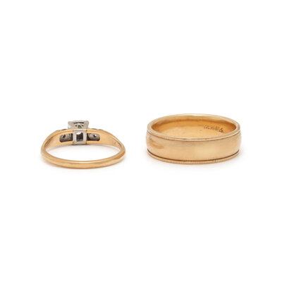 Including one yellow gold band and one bicolor gold ring set with round and transitional cut diamonds. 14 karat yellow and white gold. Ring sizes 11 1/4 and 9 1/2.