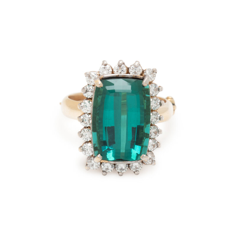 Cushion cut green tourmaline weighing approximately 7.85 carats by formula, and round diamonds weighing approximately 1.00 carat total. 14 karat yellow and white gold. Ring size 7 1/4.