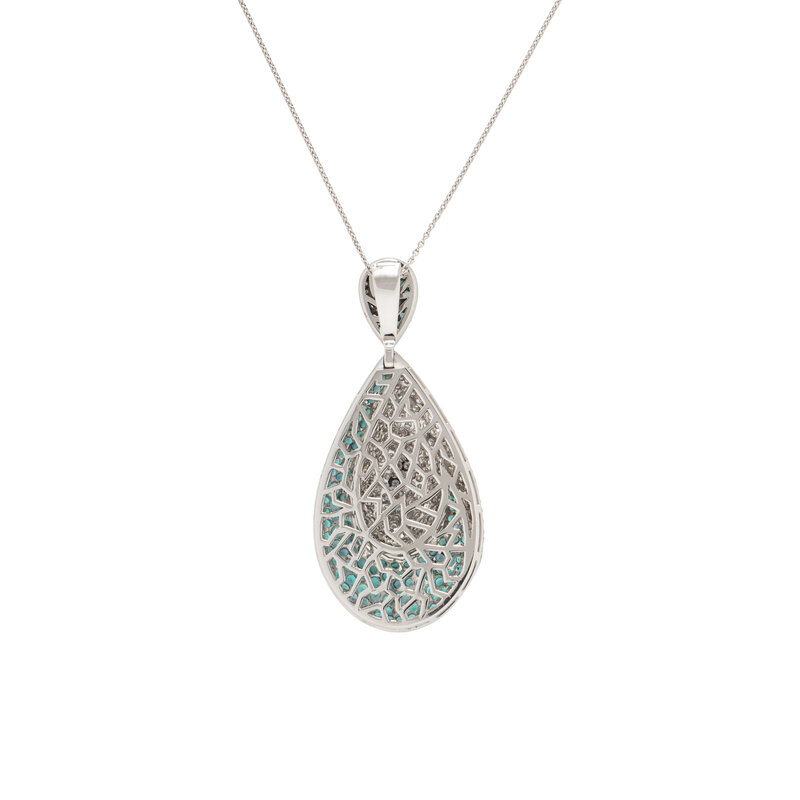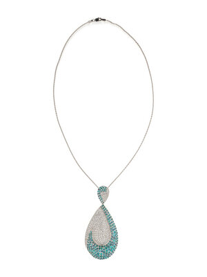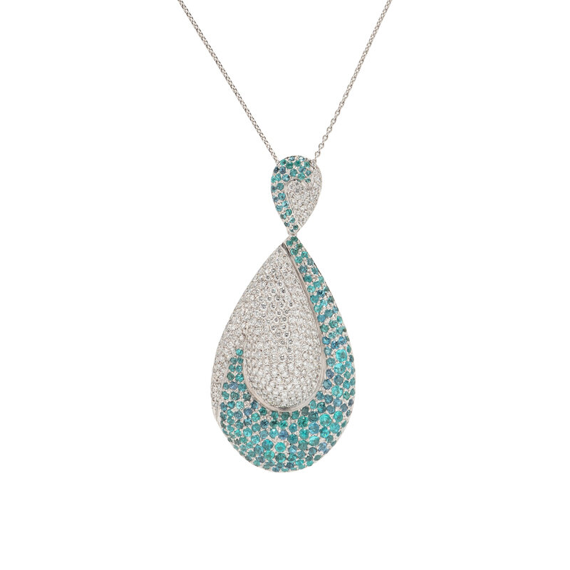 Consisting of a drop shaped pendant set with round diamonds weighing approximately 4.52 carats total, and round greenish blue tourmaline, suspended from a cable link chain. Pendant: 3 x 1 3/8 inches. Chain: 17 3/4 inches long.