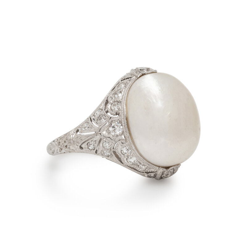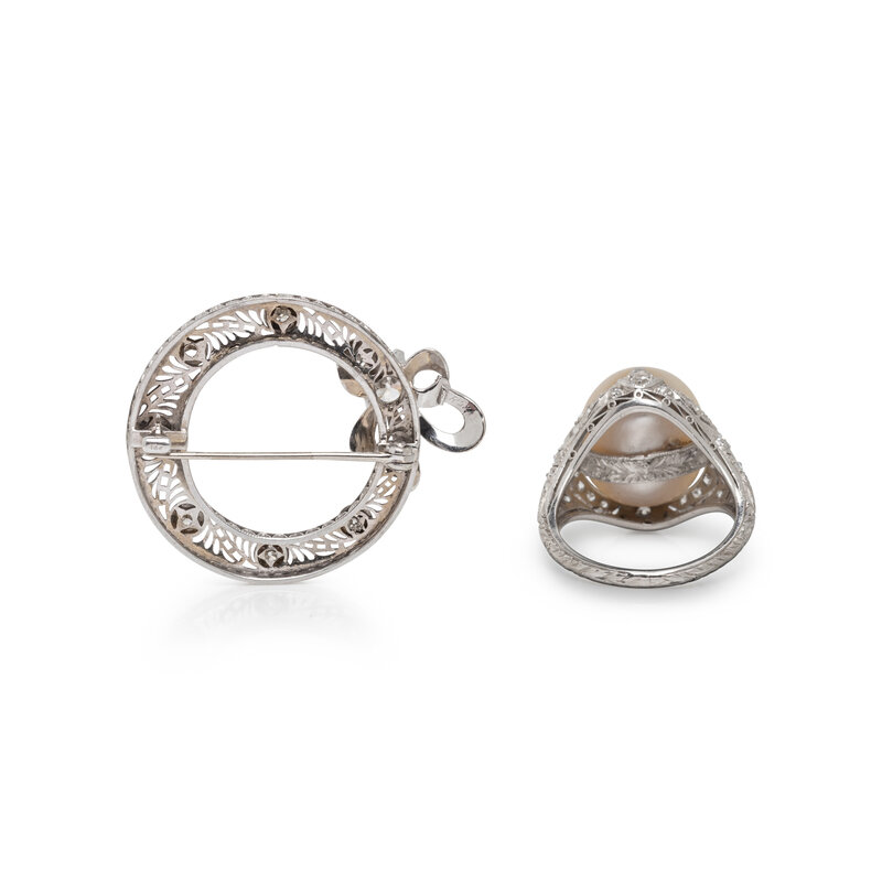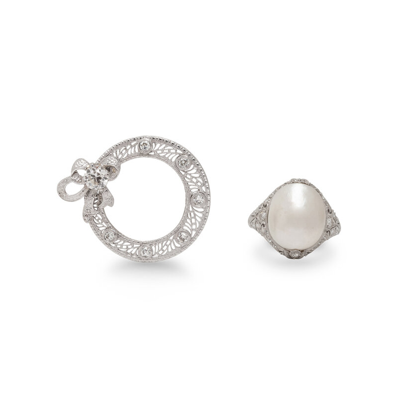 Including a platinum ring set with a baroque cultured pearl measuring approximately 14.60 x 12.40 x 9.70 mm and single cut diamonds, and a white gold brooch set with old European cut diamonds. Ring size 5 3/4. Brooch: 1 1/4 inches x 1 inch.