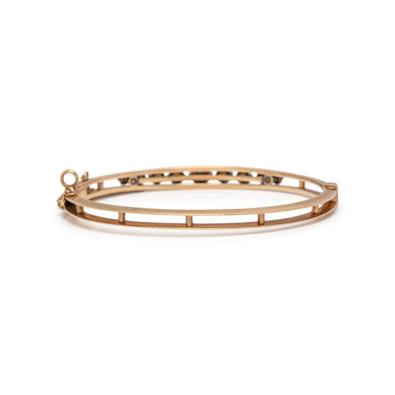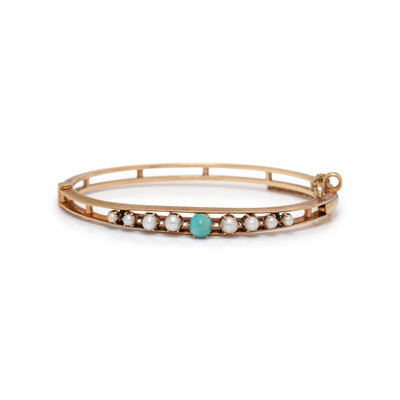 YELLOW GOLD, CULTURED PEARL, AND TURQUOISE BANGLE BRACELET