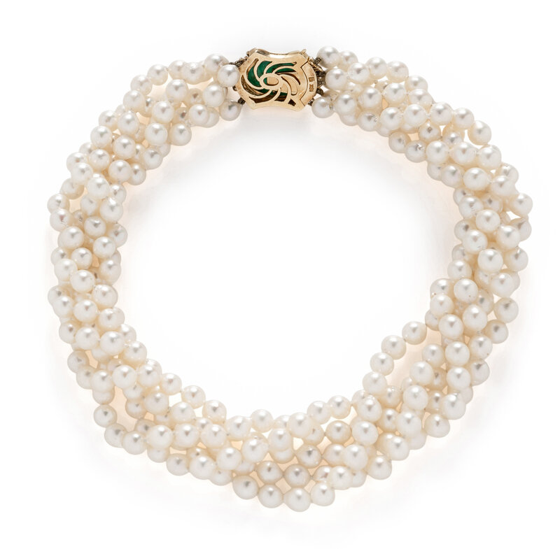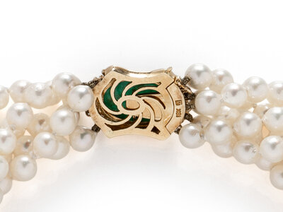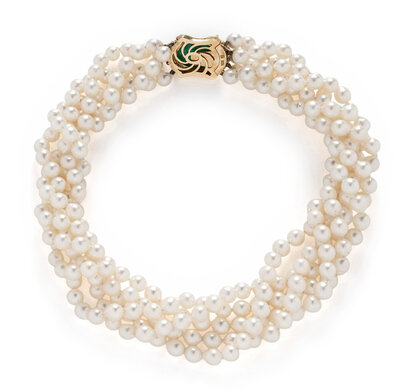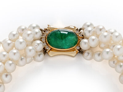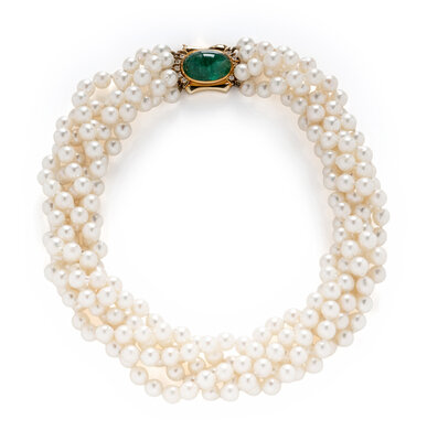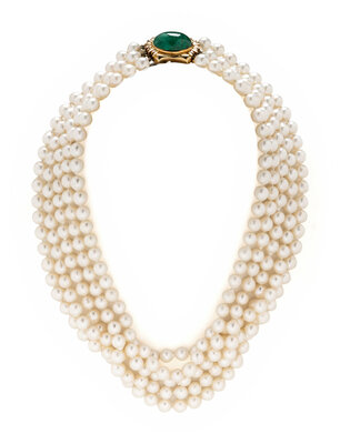 Five strands of cultured pearls measuring approximately 6.50 - 7.00 mm, with an 18 karat yellow gold clasp set with an oval cabochon emerald weighing approximately 12.80 carats by formula and round diamonds. 15 1/2 inches long.