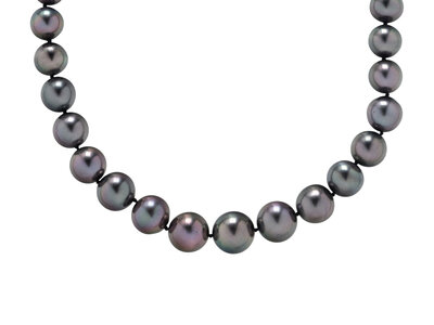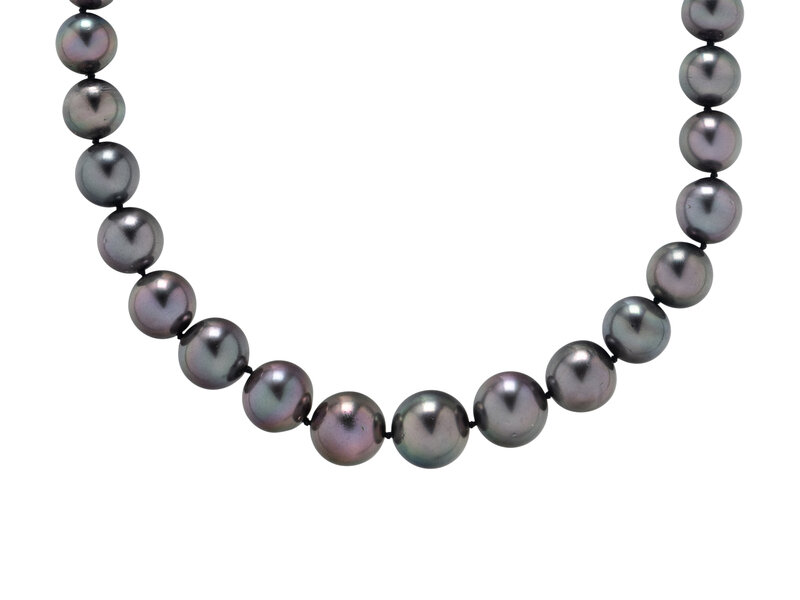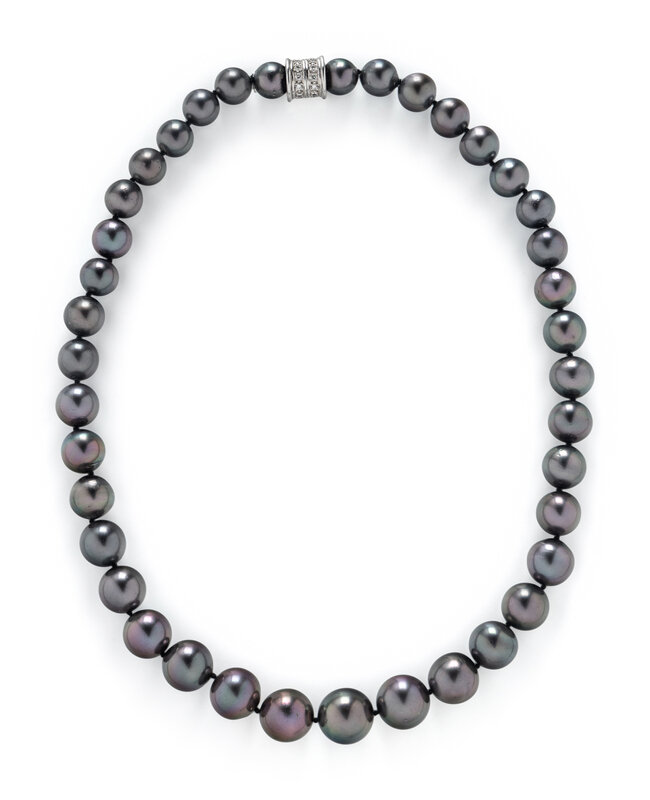 Graduating cultured gray pearls (origin of color not tested) measuring approximately 9.50 - 14.00 mm, with a white gold and round diamond clasp. 18 3/4 inches long.