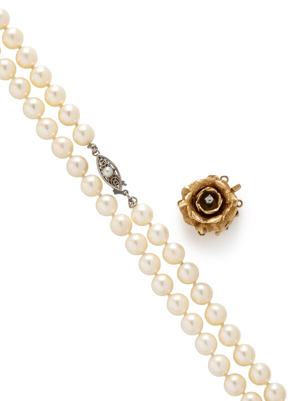 The necklace with cultured pearls measuring approximately 6.90 - 7.50 mm with a 14 karat white gold clasp set with a seed pearl, together with a 14 karat yellow gold clasp set with a single cut diamond. Necklace: 36 1/2 inches long. Additional clasp: 3/4 inch long.