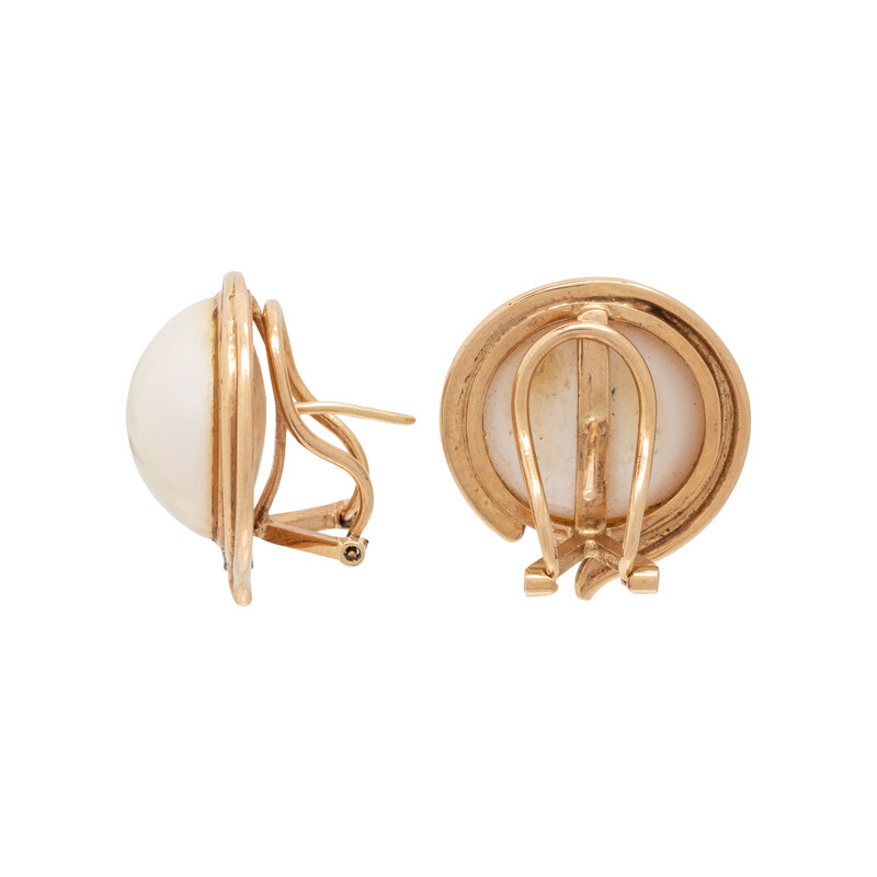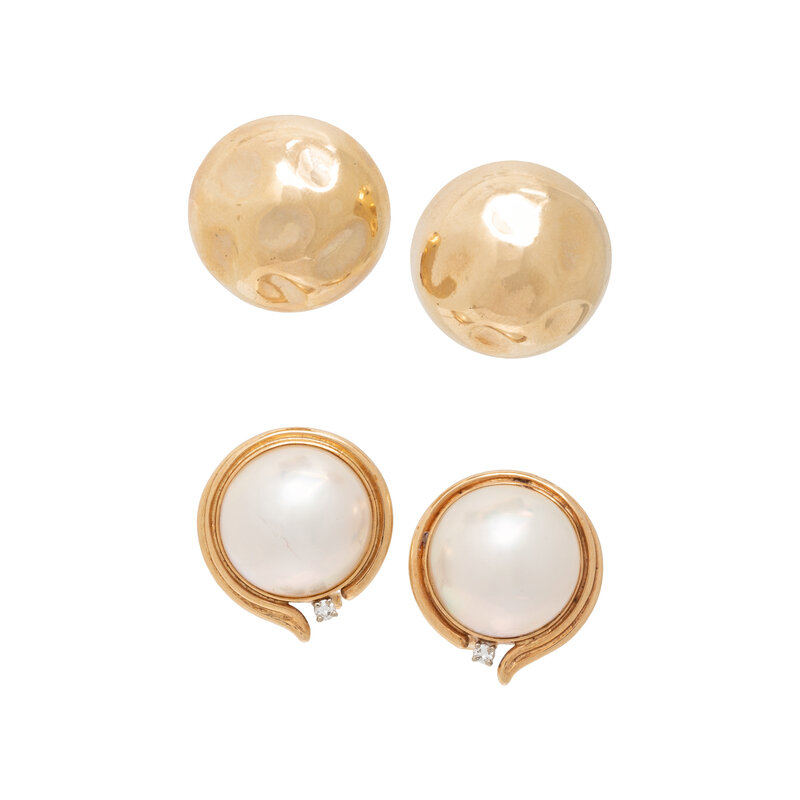 One pair with mabé pearls measuring approximately 17.20 mm and round diamonds, the other with a textured finish. 14 karat yellow gold. 1 inch and 7/8 inch long.