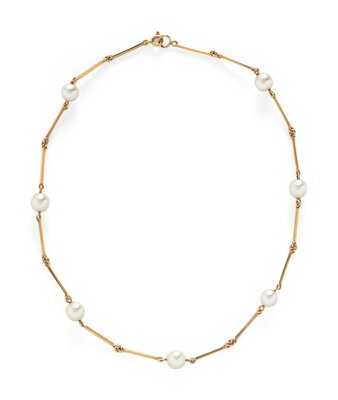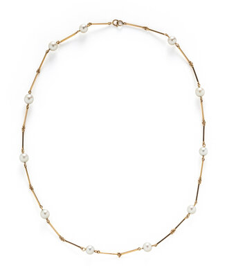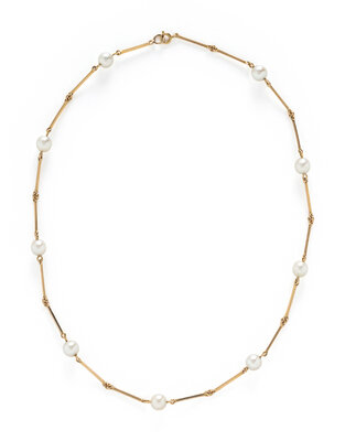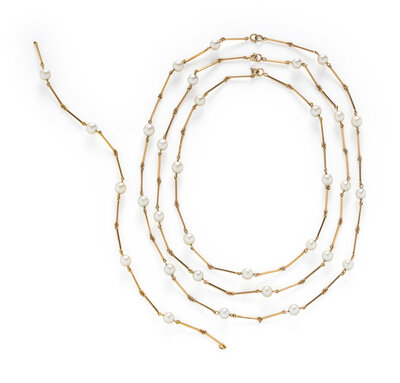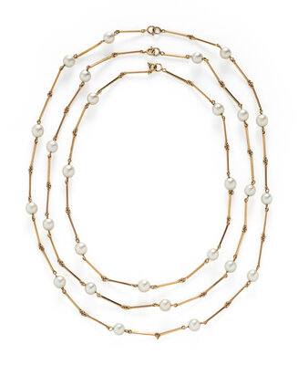THREE NESTING CULTURED PEARL AND YELLOW GOLD STATION NECKLACES