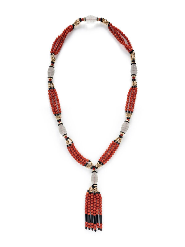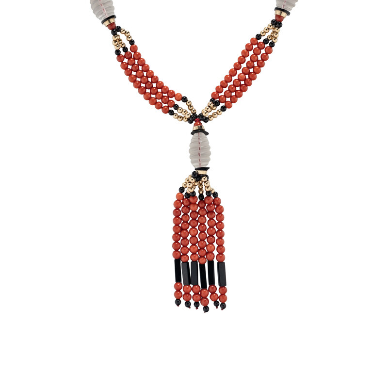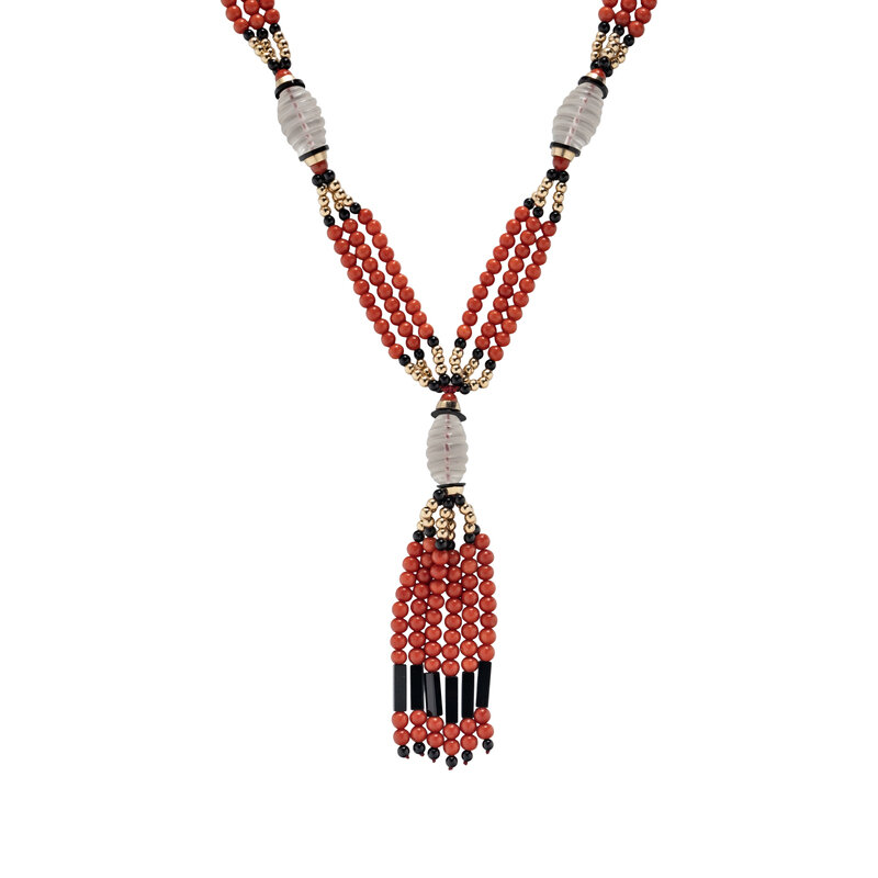 CORAL, BLACK ONYX, ROCK CRYSTAL QUARTZ, AND YELLOW GOLD TASSEL NECKLACE