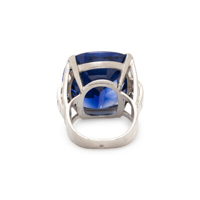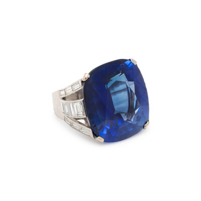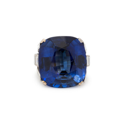 Cushion cut synthetic sapphire measuring approximately 22.91 x 21.26 x 10.81 mm and baguette cut diamonds weighing approximately 1.80 carats total. Platinum. Ring size 6 1/4.