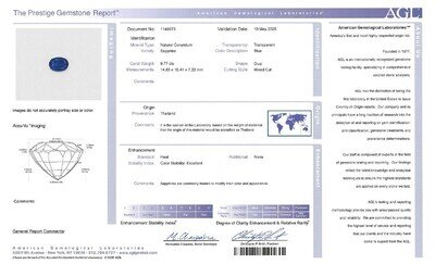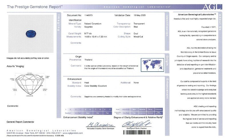 AGL, 2025, Report No. 1148073, Natural Corundum, Sapphire, Thailand, Heated
