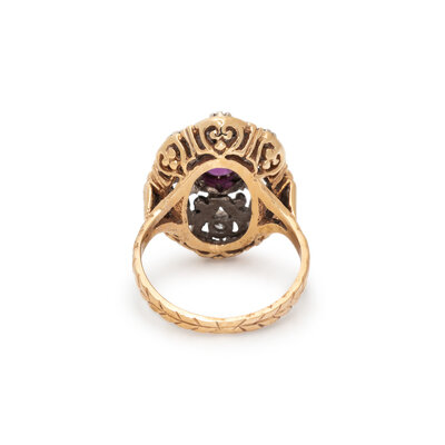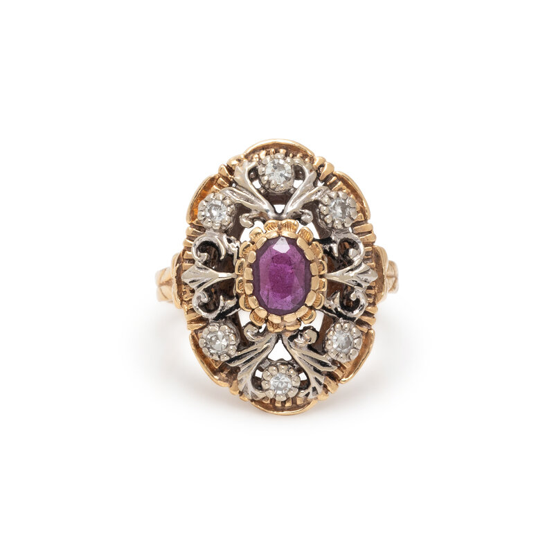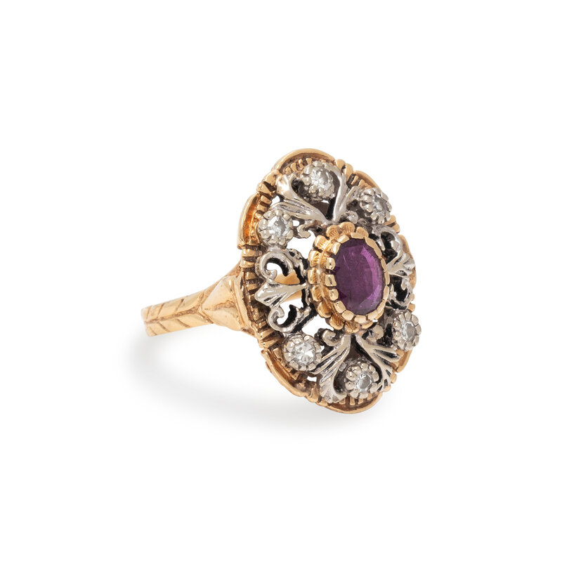Oval ruby weighing approximately 0.20 carat by formula, and single cut diamonds. 14 karat yellow and white gold. Ring size 5 1/2.