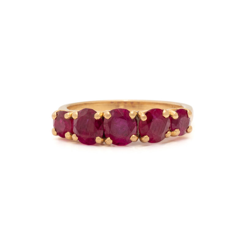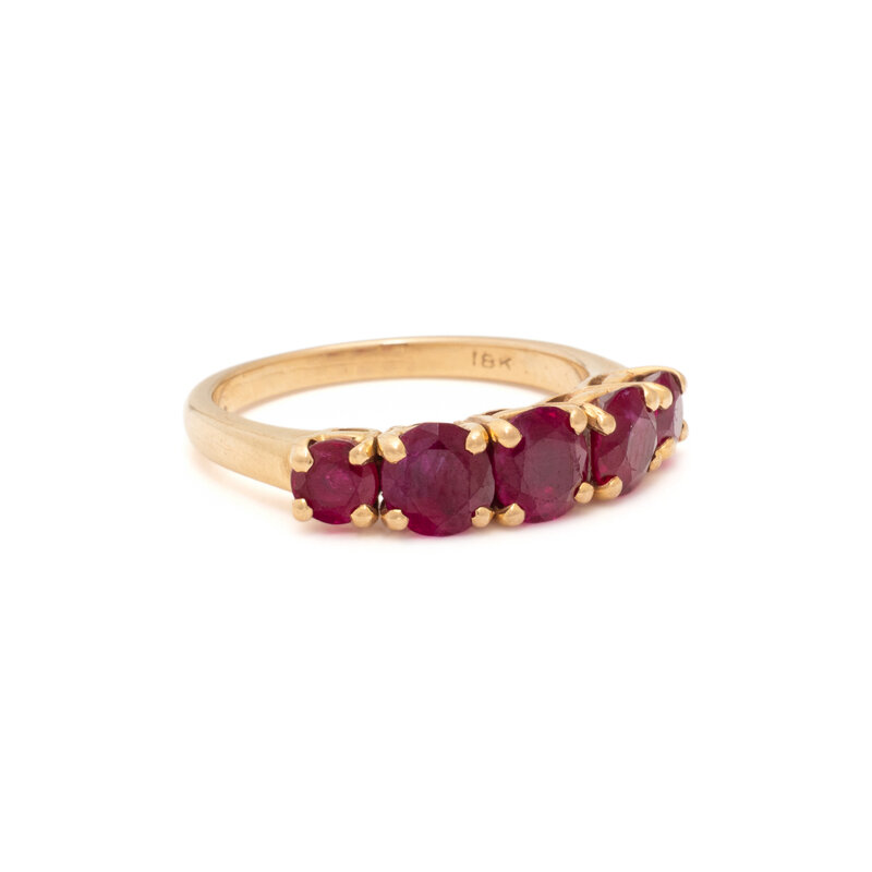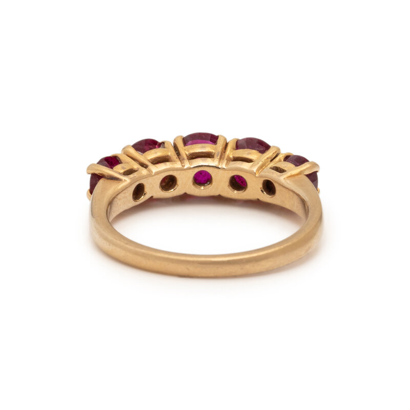 Round rubies measuring approximately 3.90 - 5.30 mm. 18 karat yellow gold. Ring size 6 1/4.