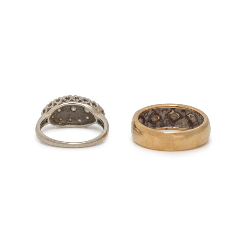 One white gold ring set with single cut diamonds, and one yellow gold ring set with round diamonds and square rubies. Ring sizes 3 3/4 and 4 3/4.