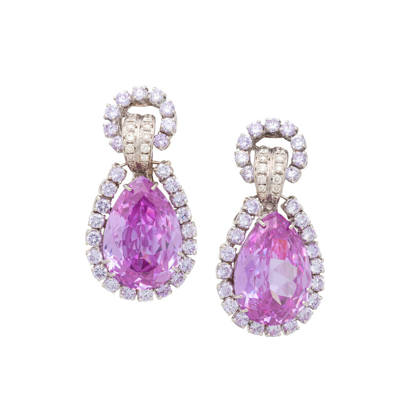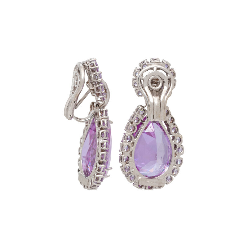 Pear shaped purple CZ measuring approximately 22.75 x 16.05 x 8.45 mm, round blue CZ, and round diamonds. 18 karat white gold. 1 3/4 inches long.