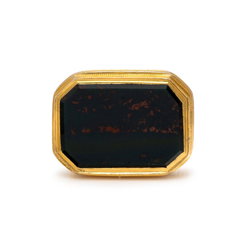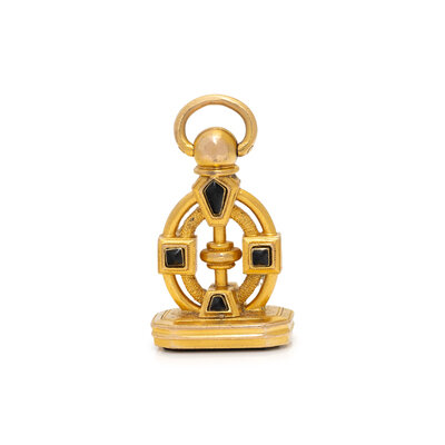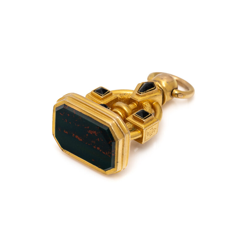 YELLOW GOLD, BLOODSTONE, AND ENAMEL FOB