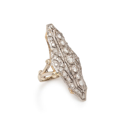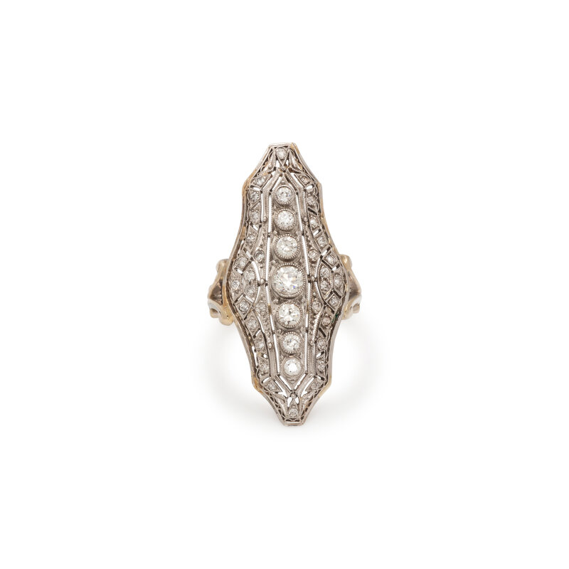 Old European and single cut diamonds weighing approximately 1.00 carat total. Platinum and white gold. Ring size 6.