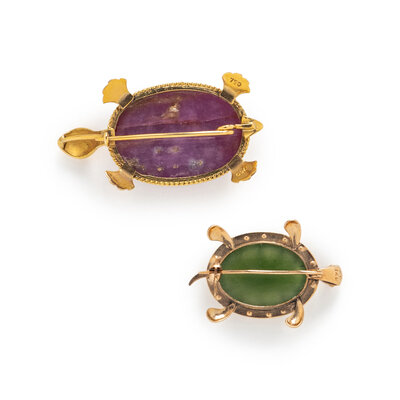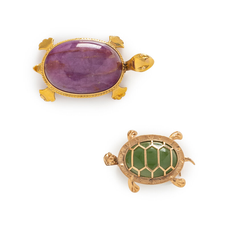 TWO GOLD AND GEMSTONE TURTLE BROOCHES