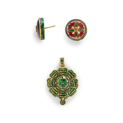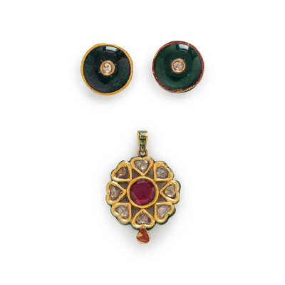 Polychrome enamel, colored glass, and polki diamonds. High karat yellow gold. Pendant: 1 5/8 inches long. Earrings: 3/4 inch wide.