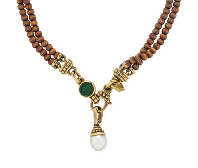 WOOD BEAD, CULTURED, PEARL, AND YELLOW GOLD NECKLACE