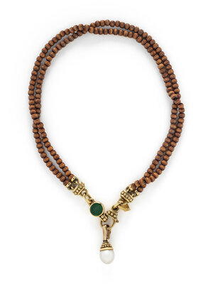 Wooden beads measuring approximately 5.00 mm, green glass intaglio, and a cultured pearl measuring approximately 12.15 mm. Yellow gold. 17 1/4 inches long.