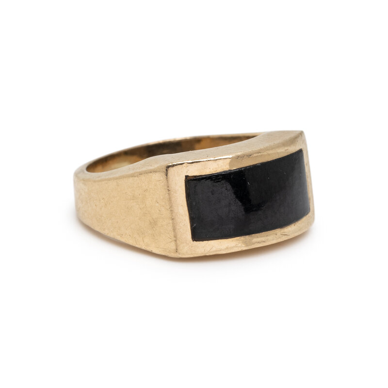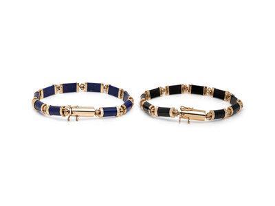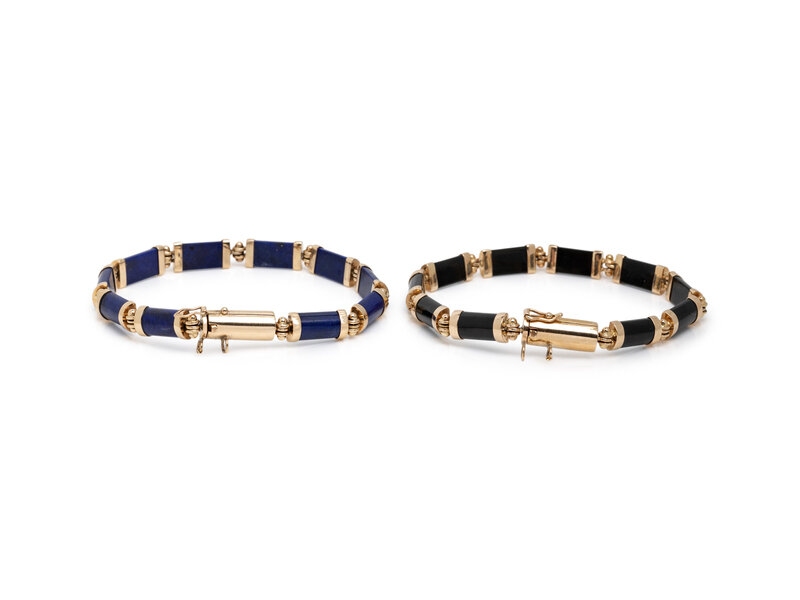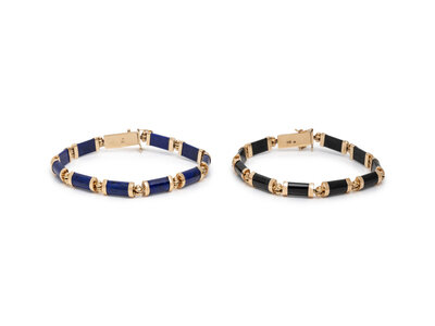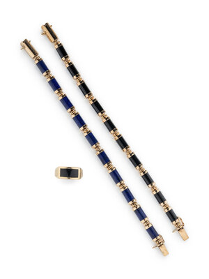 Including two bracelets and a ring, set with carved black onyx and lapis lazuli. 14 karat yellow gold. Bracelet: 7 inches long. Ring size: 6 1/4.
