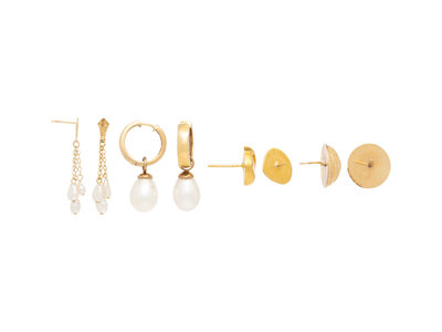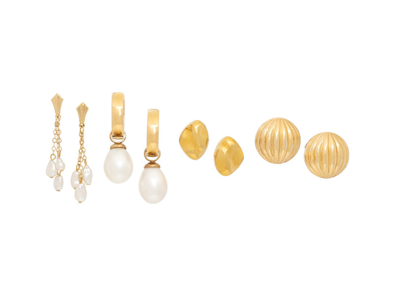 Four pairs of earrings, two pairs with cultured pearls. Yellow gold. 1/2 inch - 1 1/4 inches long.