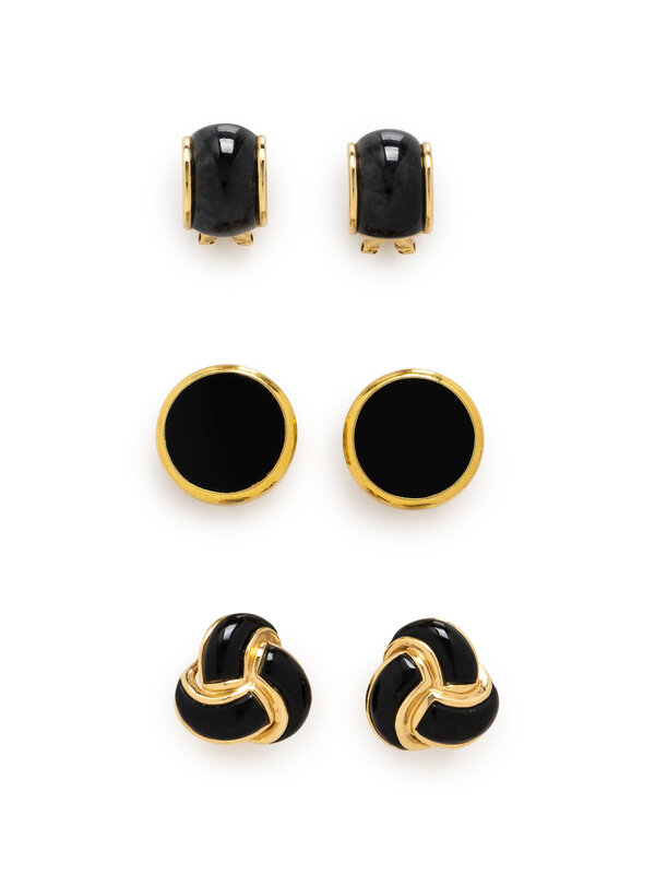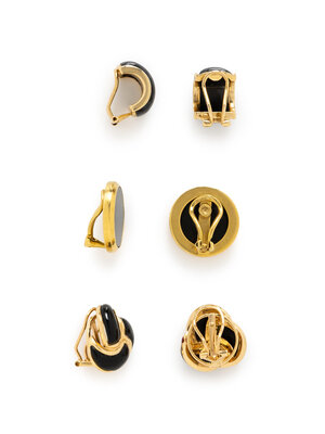 Two set with black onyx, and one set with gray jade. Yellow gold. 3/4, 3/4, and 1/2 inch long.