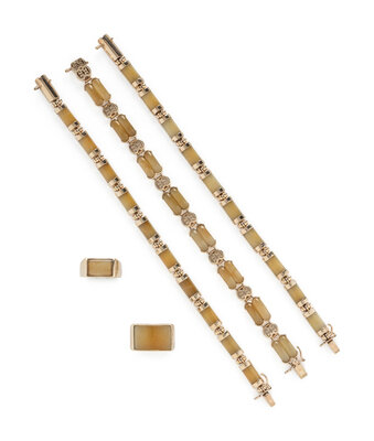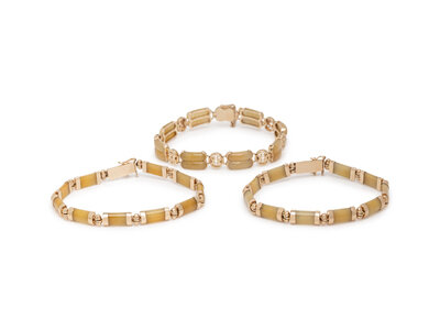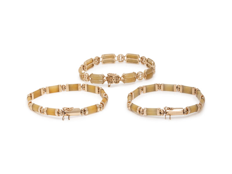 Including three bracelets and two rings, set with yellow jade. 14 karat yellow gold. Ring sizes 5 1/2 and 6. Bracelets: 7 1/4 - 7 1/2 inches long.