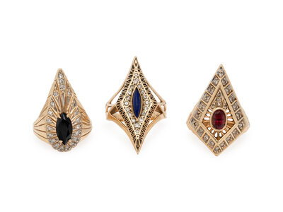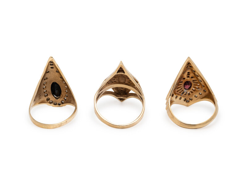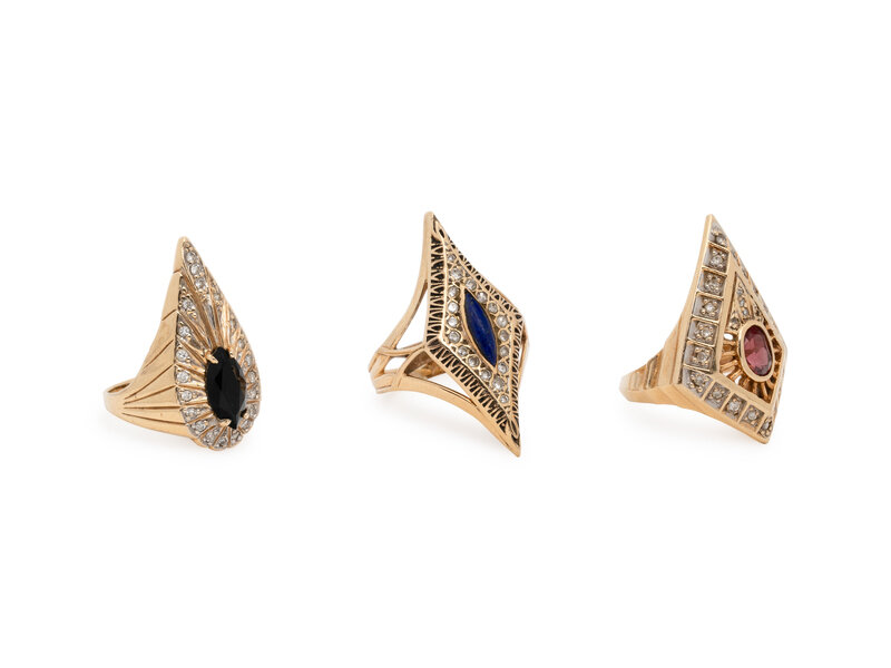 One set with an oval ruby and round diamonds, one set with oval black onyx and round diamonds, and one set with a marquise cabochon lapis lazuli and round diamonds. 14 karat gold. Ring sizes 6 1/2, 6 1/2, and 6.