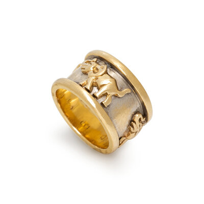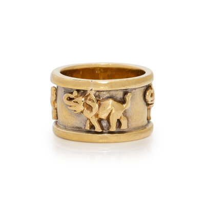 18 karat yellow and white gold. Ring size 6 1/4, 12.00 mm wide.