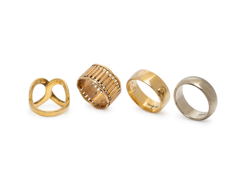 Four total, three yellow gold and one white gold. Ring sizes 4 3/4, 6 1/4, 6 1/4, and 7 1/2.