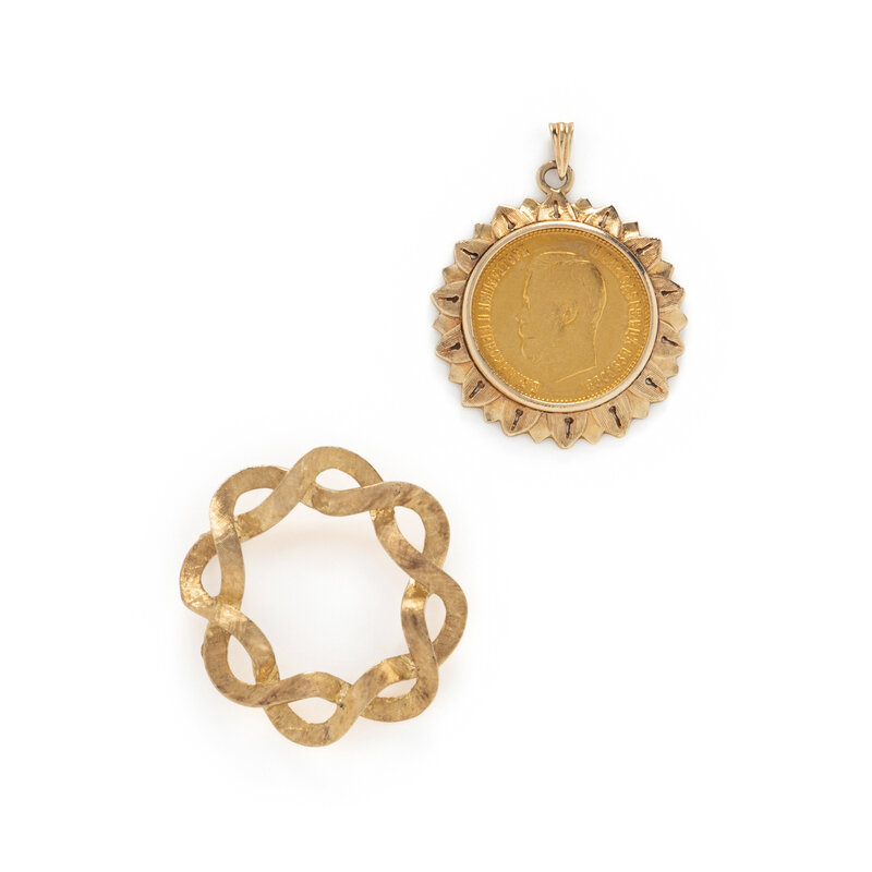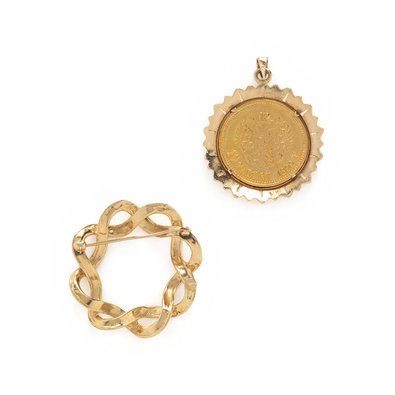 Including a wreath brooch and a coin pendant. 14 karat yellow gold. Brooch: 1 3/8 inches wide. Pendant: 1 1/2 inches long.