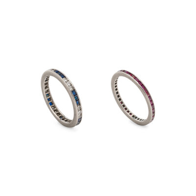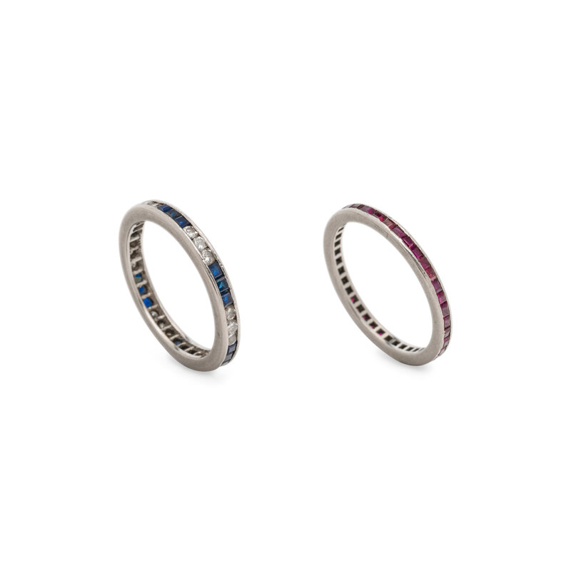 One set with round diamonds and square sapphires, the other set with square rubies. Platinum. Ring sizes 9 and 8 3/4.