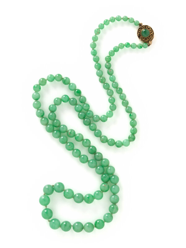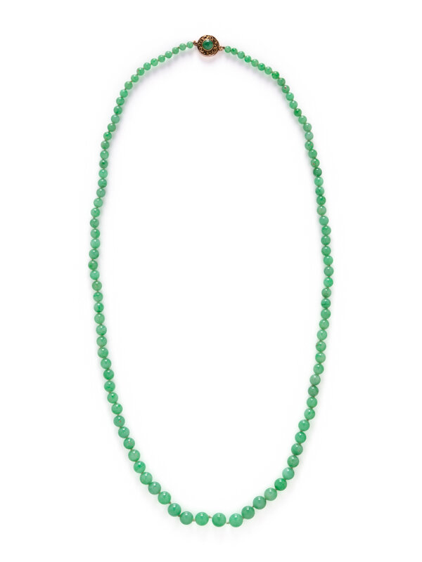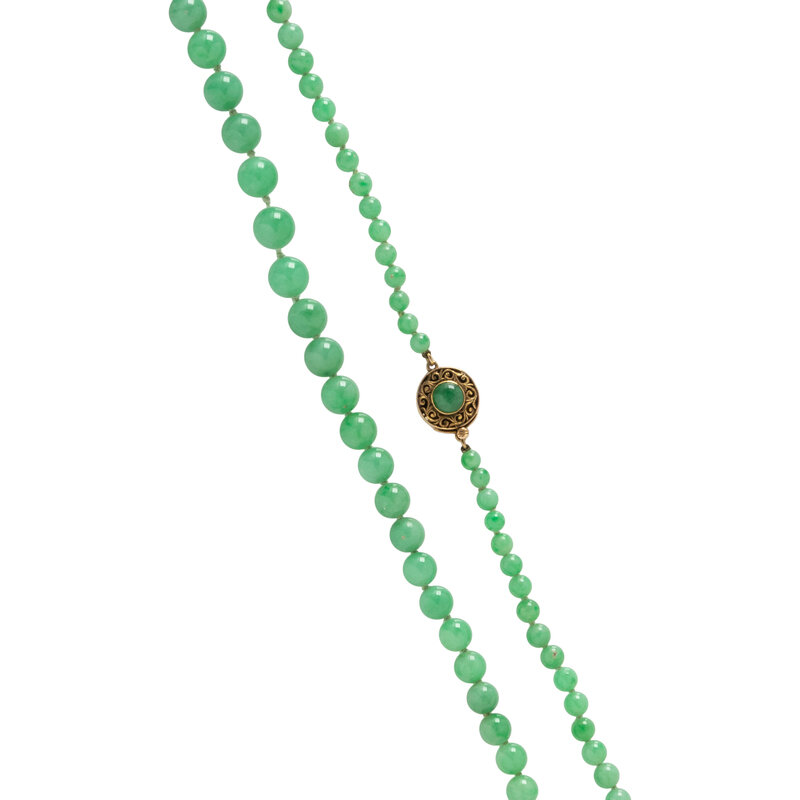 Round jade beads measuring approximately 4.50 - 9.40 mm, with a 14 karat yellow gold clasp set with a round cabochon jade measuring approximately 7.00 mm. 30 3/4 inches long.