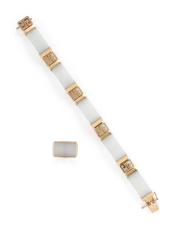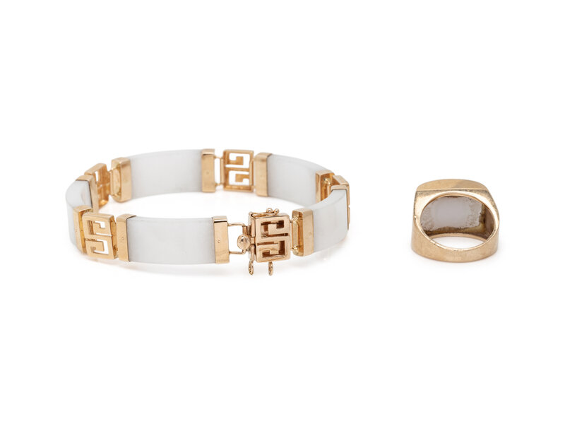 Carved white jade. 14 karat yellow gold. Bracelet: 7 1/4 inches long. Ring size 5 1/2.