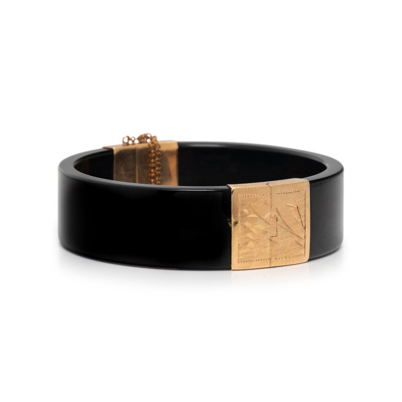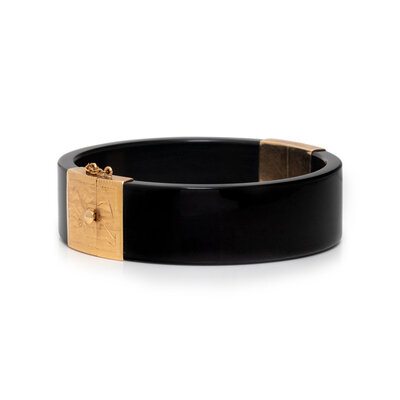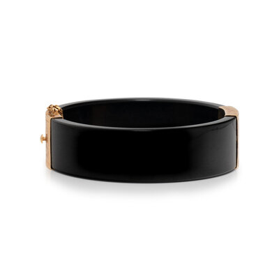 Black jade measuring approximately 17.40 mm wide, hinge with side clasp. 14 karat yellow gold. 6 3/4 inches inner circumference.